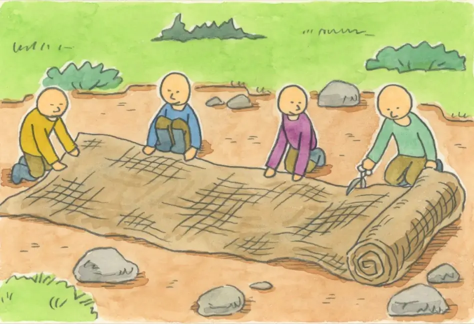 浸食箇所に沿わせるように土留めロールを配置。やがて土が覆いかぶさり、安定した表土上に植生が回復していくことが見込まれます。緑化ネットは、その過程で自然に還ります