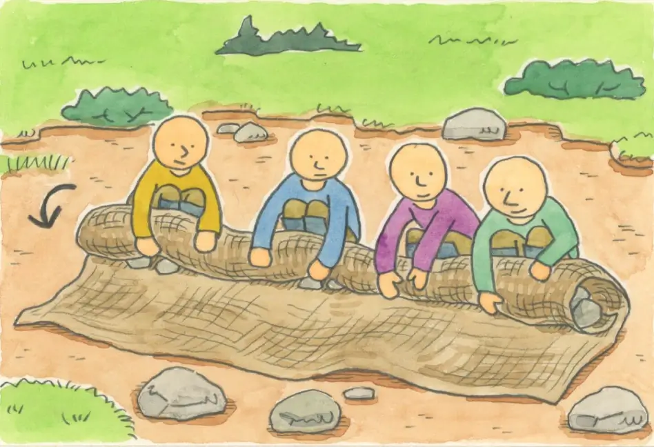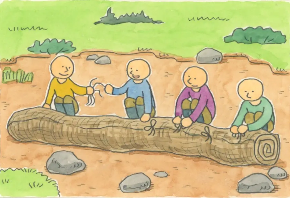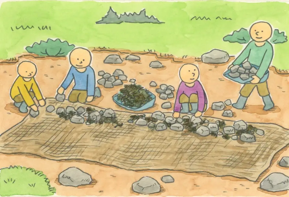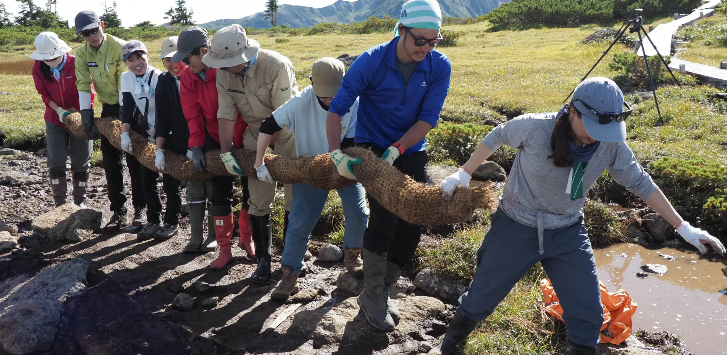 作業の主役となったのは植生復元活動で考案された「土留めロール」と呼ばれるもの。黄麻やヤシを素材とした緑化ネットの内側に、周辺に散らばる軽石をぐるぐると巻き込むという手順で作成します。これを侵食を受けた箇所の法面に沿わせて配置することで、水を通しながらも土の流失を防ぎ、同時に保温・保湿も図ることで、植物の発芽環境を整える狙いがあります。雲ノ平山荘が15年に渡る東京農業大学との連携のもとで実践し、着実に成果をあげてきた手法です。